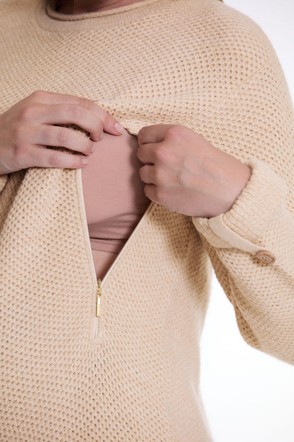 De Honey gebreide zwangerschaps- en voedingstruijurk met lange mouwen, gemaakt in Europa, is zeer zacht en aangenaam om te dragen. Het is gemaakt met Frans garen en knopen, een ronde, geribde gebreide kraag, vaste mouwen met manchetten en 2 voorzakken met een olijfhouten knoop. Het Honey zwangerschapsjurkje heeft 2 onzichtbare sluitingen, zodat je baby met een gerust hart borstvoeding kan geven. Gecertificeerd OEKO-TEX STANDARD 100, het zal u begeleiden tijdens uw zwangerschap en lang daarna. Deze jurk kan gemakkelijk worden gedragen met onze panty's voor aanstaande moeders.