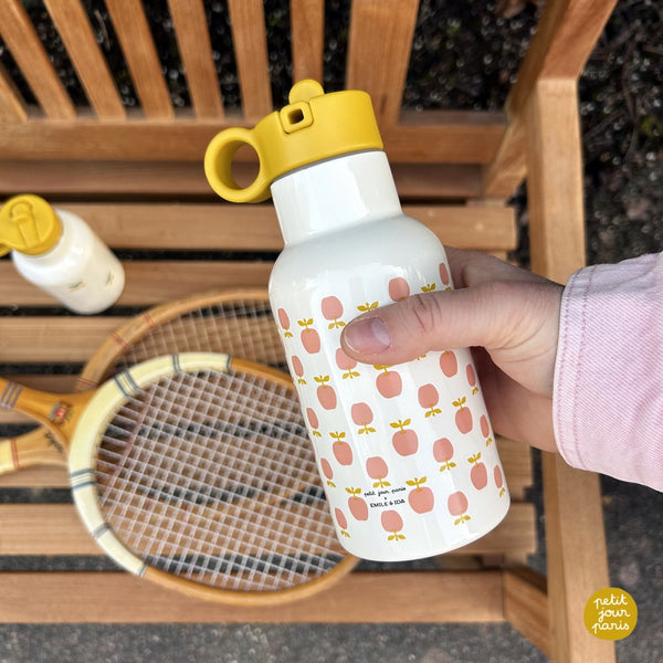 Cette adorable gourde est née de la rencontre entre Petit Jour et l’univers poétique d’Émile & Ida. Une collaboration fruitée et raffinée pour hydrater les tout-petits avec style, à la maison comme en balade.