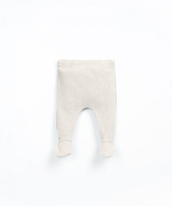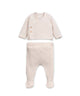 Le haut s’attache facilement grâce à son système de fermeture croisée, idéal pour les tout-petits encore sensibles aux manipulations. Le bas à pieds, lui, garde les petits orteils bien au chaud sans chaussettes qui glissent. Le tout dans une maille naturellement chinée, aux tons écrus apaisants.