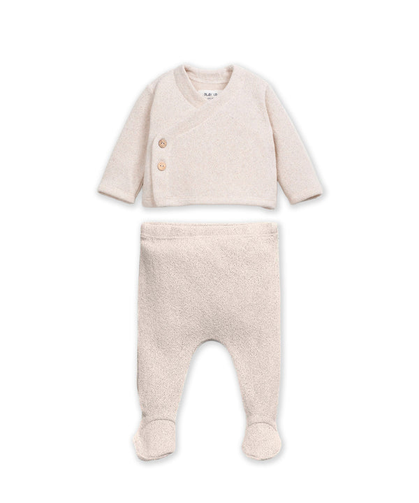 Ce délicat ensemble en coton recyclé habille bébé d’un confort durable et responsable. Composé de deux pièces essentielles — un haut cache-cœur à la coupe croisée et un pantalon à pieds intégrés — il offre douceur, chaleur et praticité, dès la naissance.