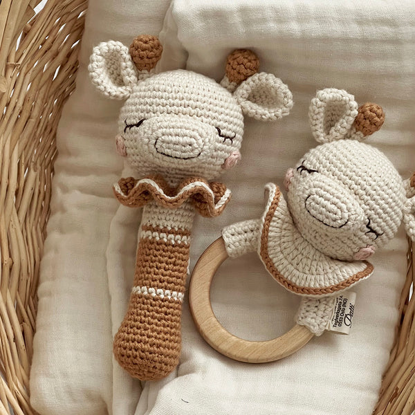 Découvrez notre adorable hochet girafe au crochet, confectionné avec soin dans une teinte caramel irrésistible. Parfait pour les petites mains curieuses, ce compagnon doux et léger stimule l'éveil de bébé tout en le divertissant. Ses formes arrondies et sa texture douce en font un jouet sûr et réconfortant. Idéal dès les premiers mois, ce hochet girafe ravira les parents en quête de jouets tendres et authentiques pour leur trésor.