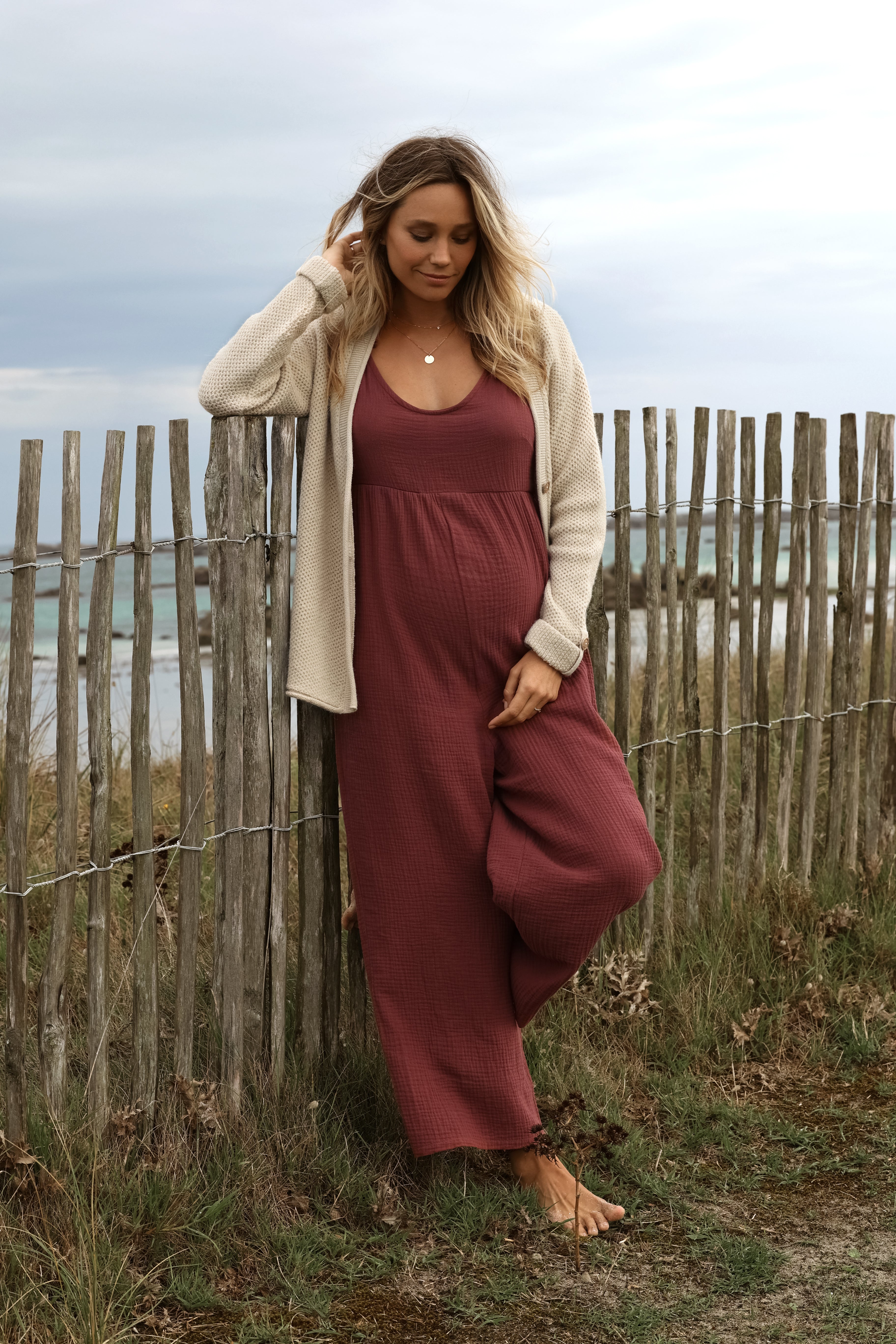 Het pruimkleurige zwangerschaps- en voedingspak Canyon van Cache Coeur is gemaakt van katoengaas en begeleidt je tijdens je zwangerschap en nog veel meer. Het zal je bondgenoot zijn tijdens het geven van borstvoeding dankzij de ritssluiting onder de borst. De ritssluiting bestaat uit twee schuifregelaars en zorgt ervoor dat u met één beweging gemakkelijk toegang heeft tot de borst waarmee u borstvoeding wilt geven.