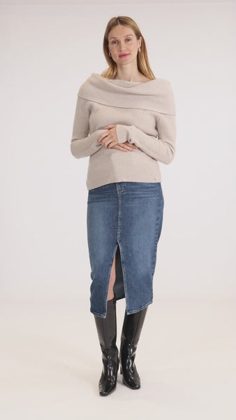 Kim est un pull de maternité très doux fabriqué en laine et cachemire, un must-have de la saison hivernale. Sa matière, en maille côtelée, extensible et souple, vous apporte un confort au quotidien pendant toute votre grossesse et longtemps après.