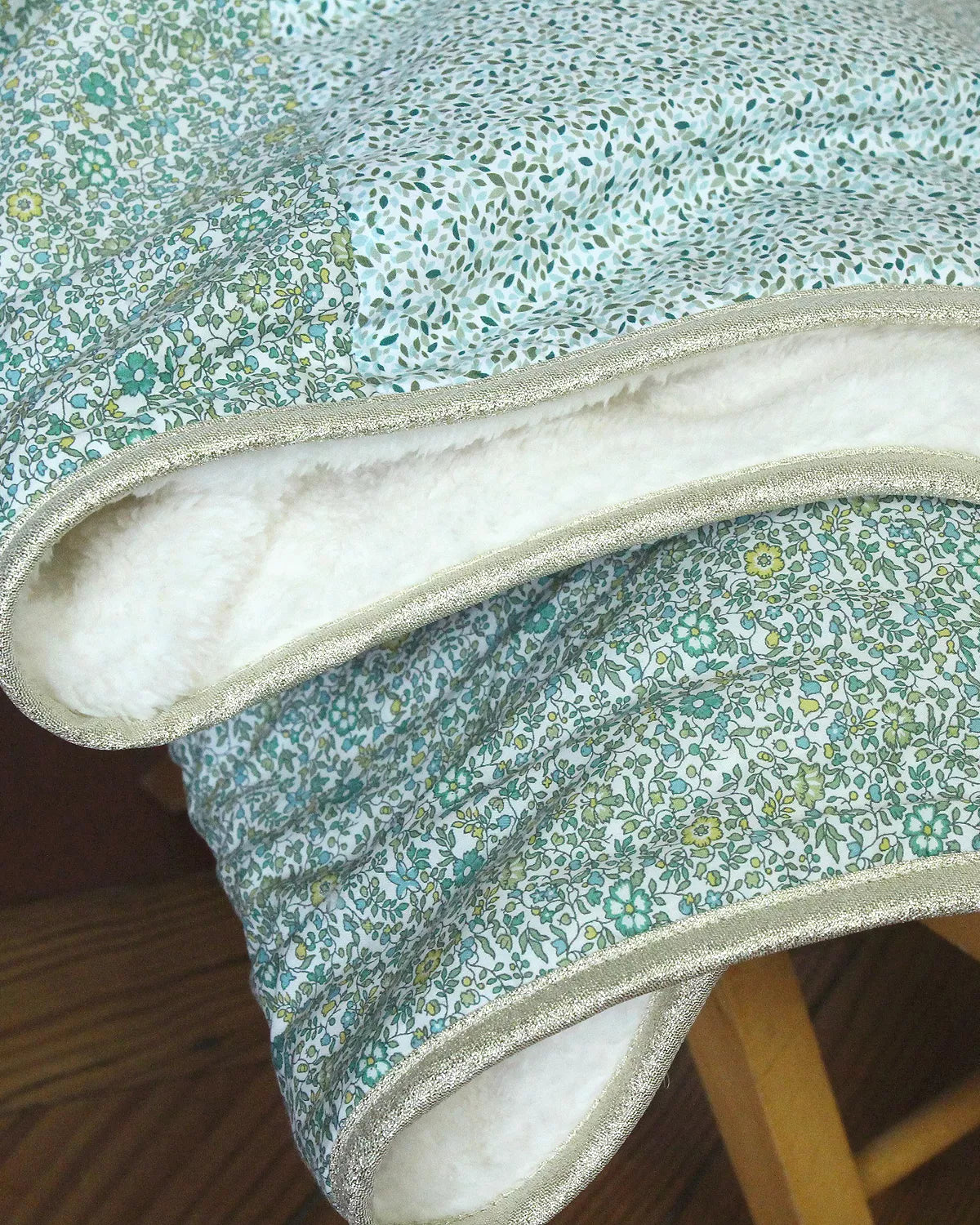 Dit is een van de mooiste babydekentjes ontworpen door Barnabé loves coffee. Gemaakt van een mix van 2 Liberty® stoffen en aan de achterkant gevoerd met een ontzettend zachte en warme verbeterde fleece... De omtrek is afgewerkt met een gouden lamé bies voor dat kleine Barnabé chique tintje. Het zal de baby vergezellen in zijn wieg, bij uitstapjes met de kinderwagen, als speelkleed tijdens een bezoek aan vrienden of zelfs als dekentje... Een nuttig en chique geboortecadeau.