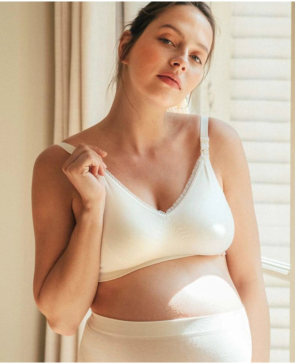De biologische natuurlijke naadloze zwangerschaps-bh is de ideale bh voor toekomstige moeders. De snit omhult je borst subtiel en de zachte, verfijnde kant biedt je al het comfort waarnaar je op zoek bent. Dankzij de traditionele borstvoedingsclips en de 4 nietposities past deze bh zich aan de evolutie van je borst en borstvoeding aan. Naadloze technologie garandeert flexibiliteit en zorgt ervoor dat deze bh tijdens en na de zwangerschap gedragen kan worden.