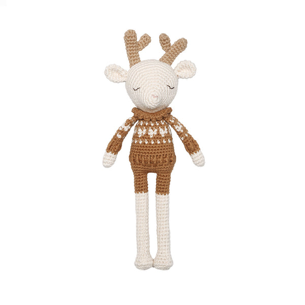 Avec sa frimousse paisible et ses bois sur la tête, ce renne invite à la tendresse. Habillée d’un joli pull de Noël , il évoque la douceur d’un hiver au coin du feu.