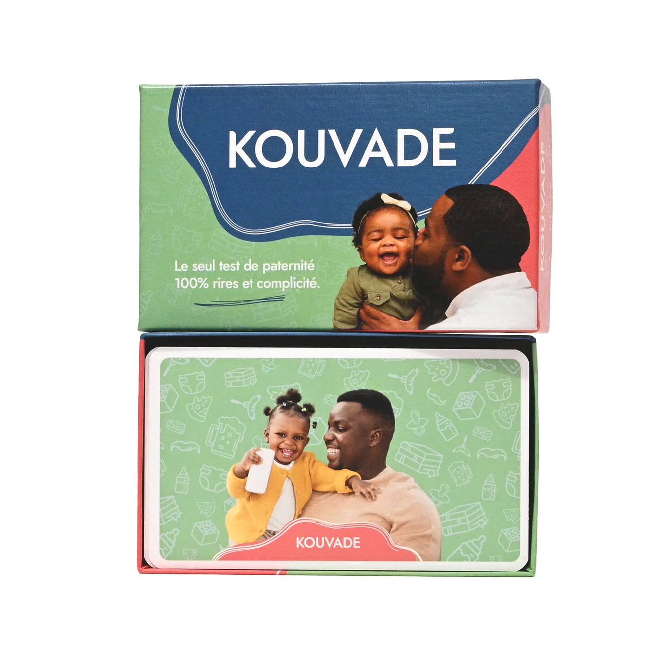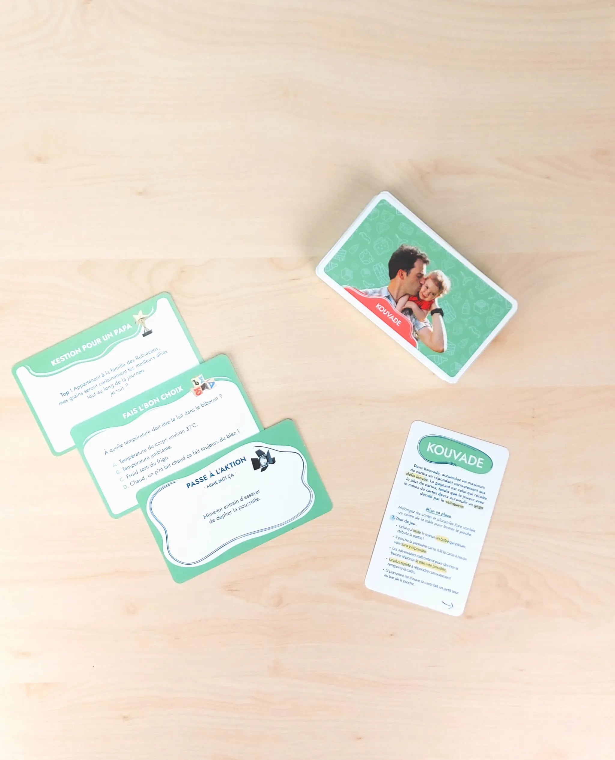 Kouvade est le premier jeu de société pensé pour le futur papa : drôle, léger, inclusif. Il permet de rire, d’apprendre un peu, de discuter autrement – seul, à deux ou entre potes. Un cadeau de naissance qui fait sens, sans cliché, et donne enfin la place qu’il mérite à l’homme derrière le titre de papa.