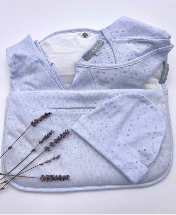 Découvrez la pochette 1ers jours, un ensemble complet pour votre nouveau-né. Fabriqué en coton doux, cette pochette contient trois pièces essentielles : un legging et un haut fermeture cache-coeur ainsi qu'un bonnet assorti. Idéal pour préparer votre valise de maternité. Vanille Coton a fait confiance à la marque Caramel au sucre.