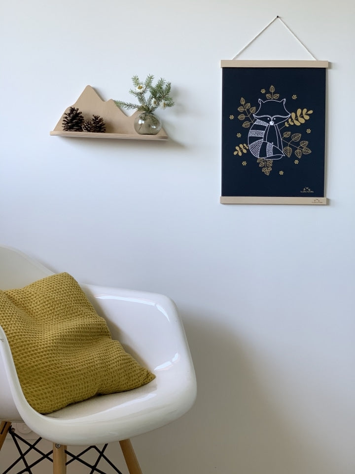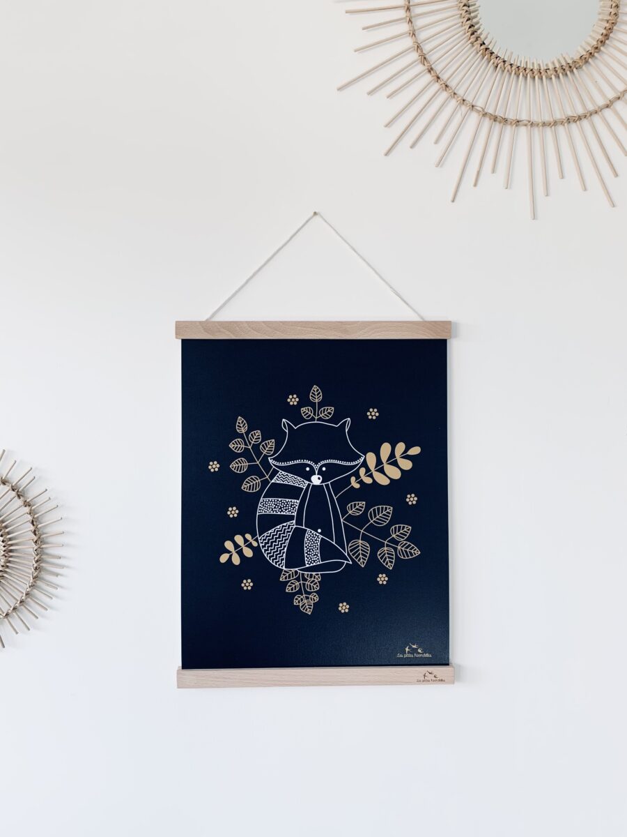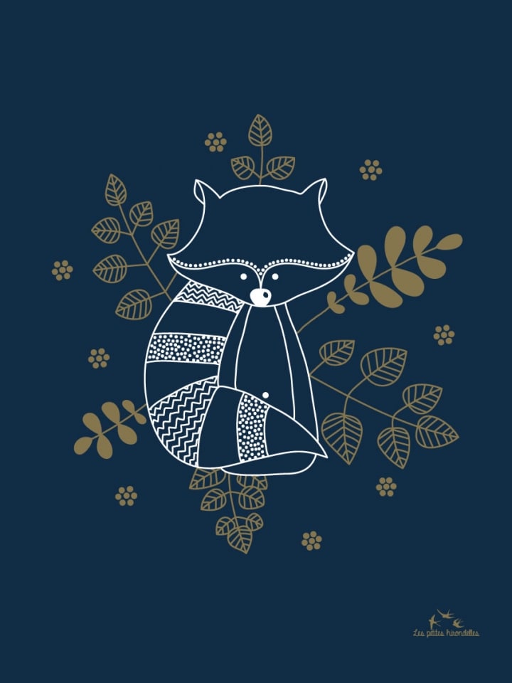 Wanneer de nachtelijke wandeling van een kleine wasbeer zichzelf uitnodigt op onze muren. De illustratie wordt geaccentueerd door enkele gouden accenten. Het kan worden opgehangen met een Clic-clac posterhouder, ingelijst of eenvoudigweg op een plank of meubelstuk worden geïnstalleerd.