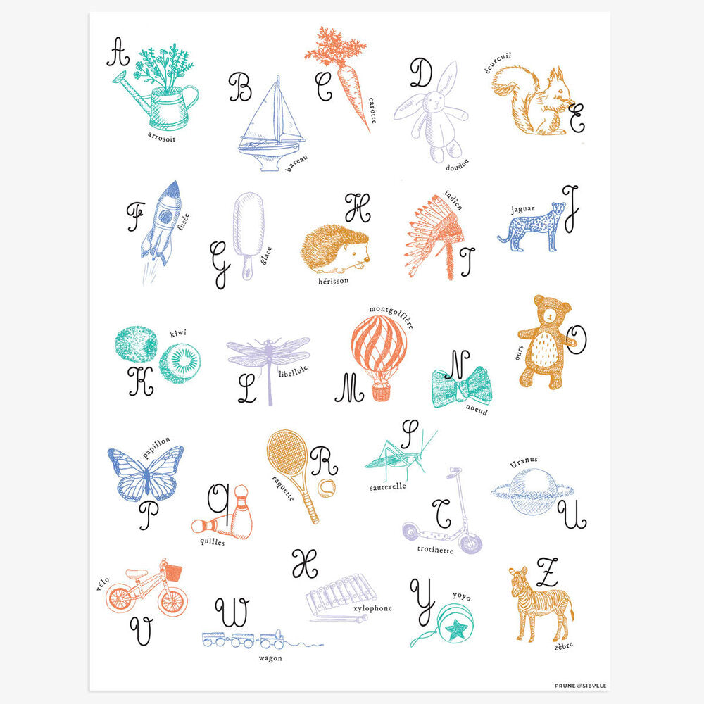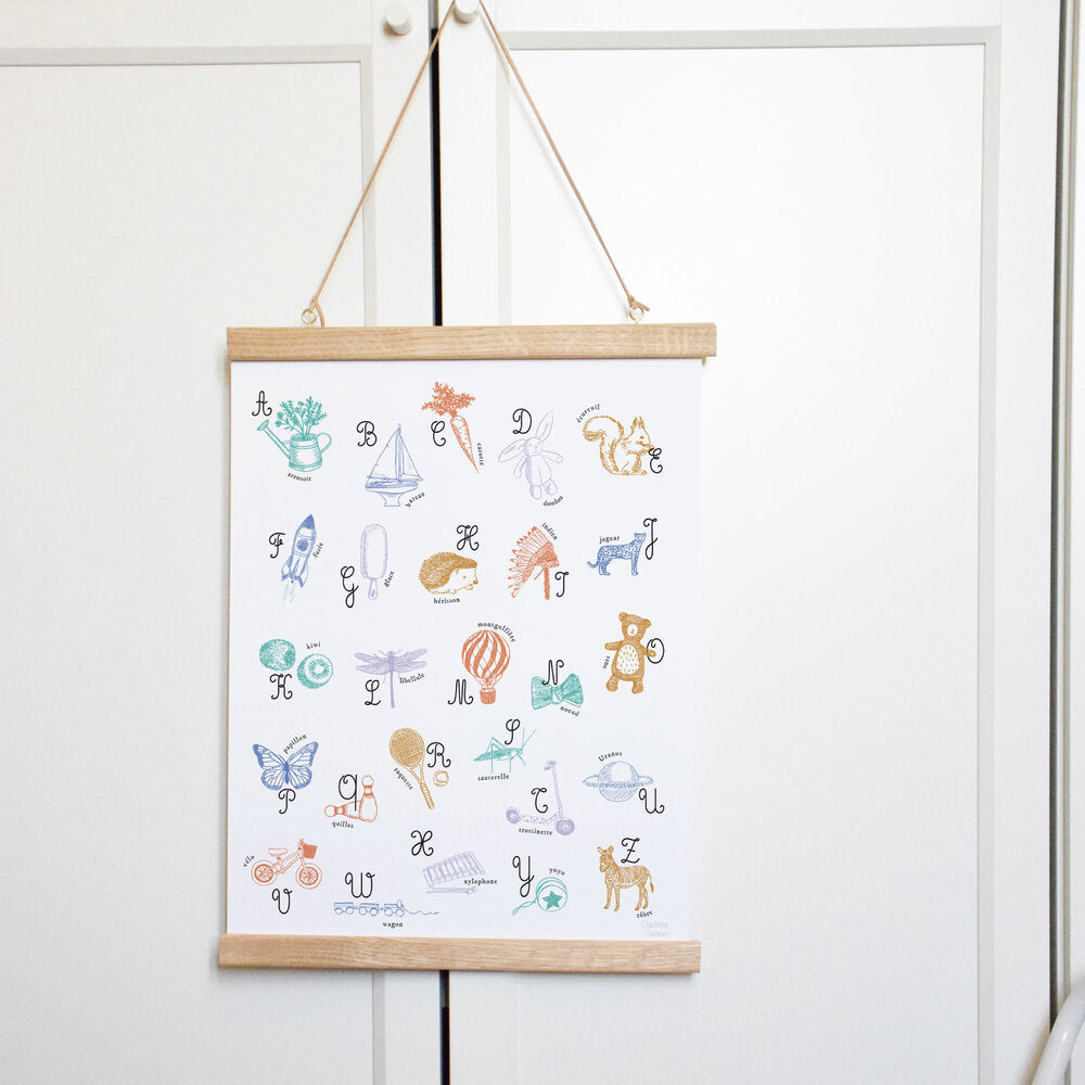 Leren terwijl je plezier hebt, dat is de missie van deze leuke en poëtische poster. De hele wereld van de kindertijd is samengevat in 26 letters. Het is ook een leuk geboortecadeau dat eerst een decoratief doel zal hebben voordat het een paar jaar later nuttig zal worden...