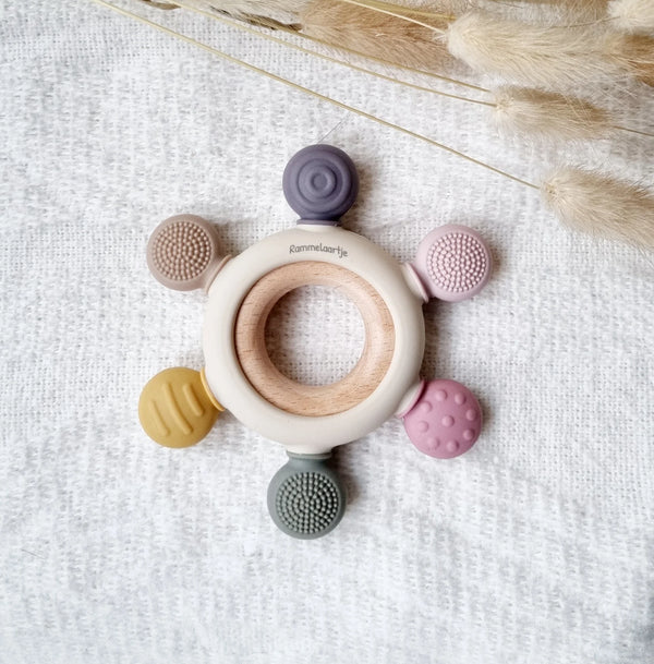 Imaginé par Rammelaartje et fabriqué avec soin aux Pays-Bas, ce hochet combine esthétisme scandinave et fonctionnalité bien pensée. Une création douce, ludique et responsable, à glisser dans toutes les petites mains curieuses.