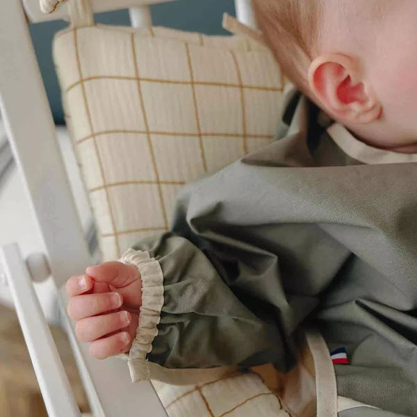 Sa large poche récupératrice à la base attrape miettes, purée ou peinture avec efficacité, rendant les apprentissages encore plus libres et joyeux. Les finitions en biais de coton ajoutent une touche délicate, tandis que sa coupe ample (75 cm d’envergure de manche à manche) assure confort et protection de 6 à 24 mois.