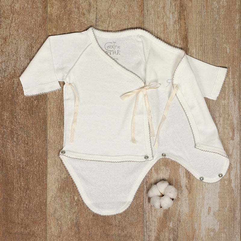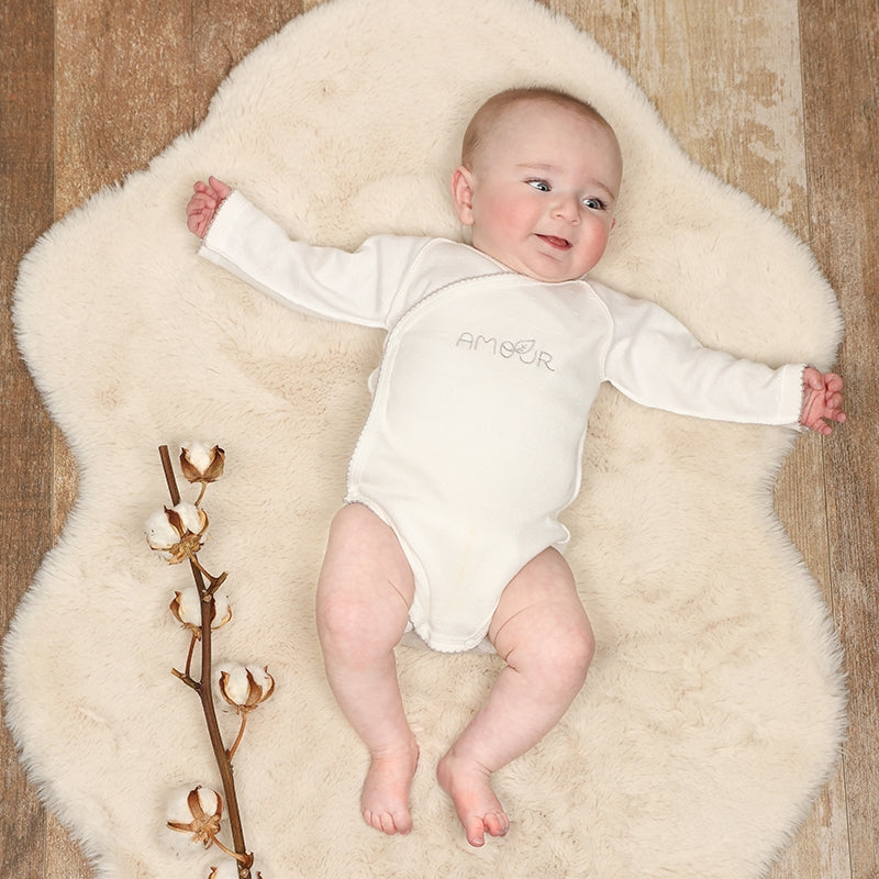 De AMOUR geborduurde crossover bodysuit is erg zacht. Het is heel gemakkelijk om de baby aan te trekken en voor extra delicatesse wordt het gesloten met veters.