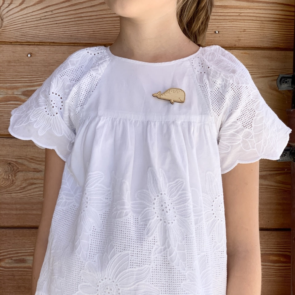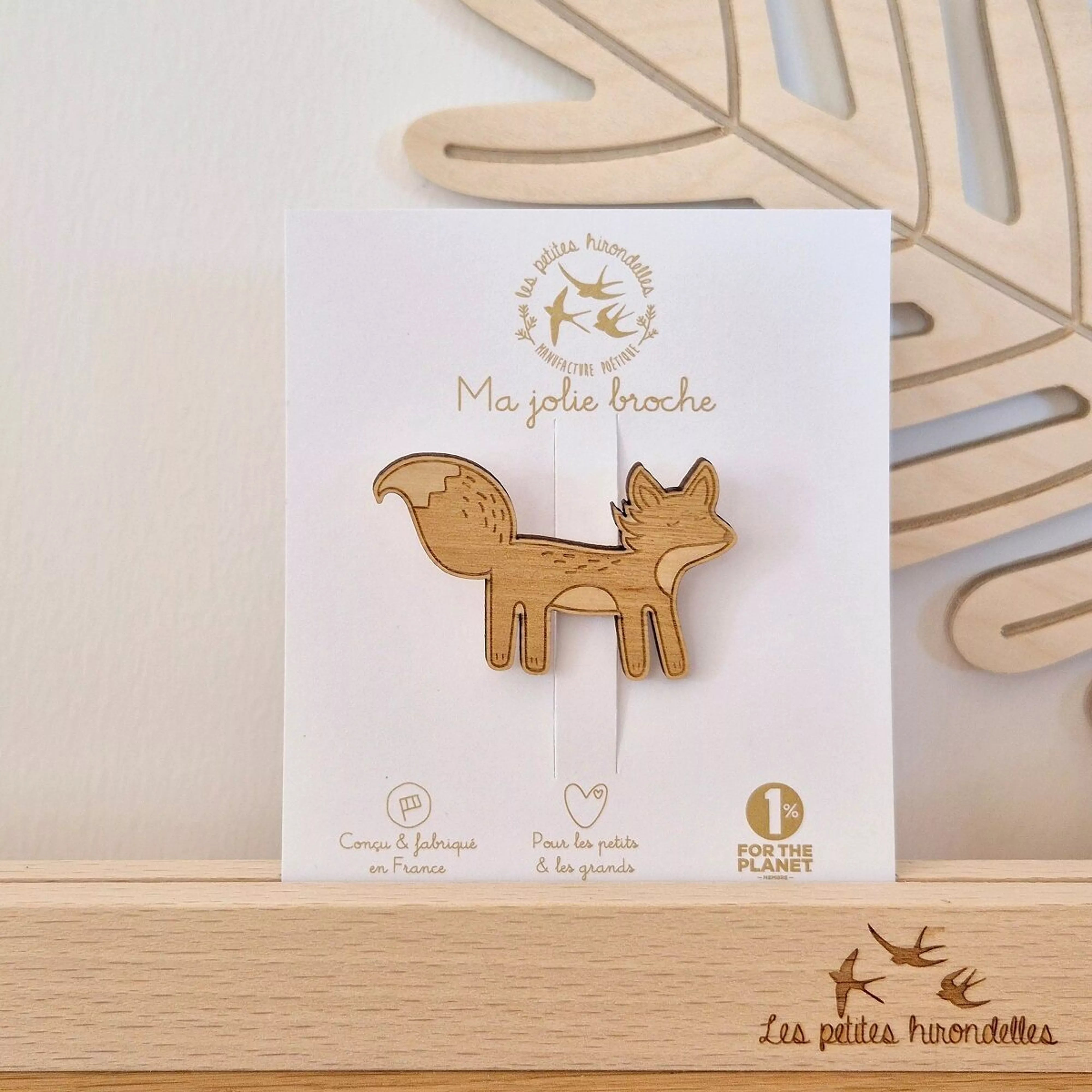 Deze broche is gemaakt van hout, met een metalen sluiting. Het is ontworpen en vervaardigd in Frankrijk.
