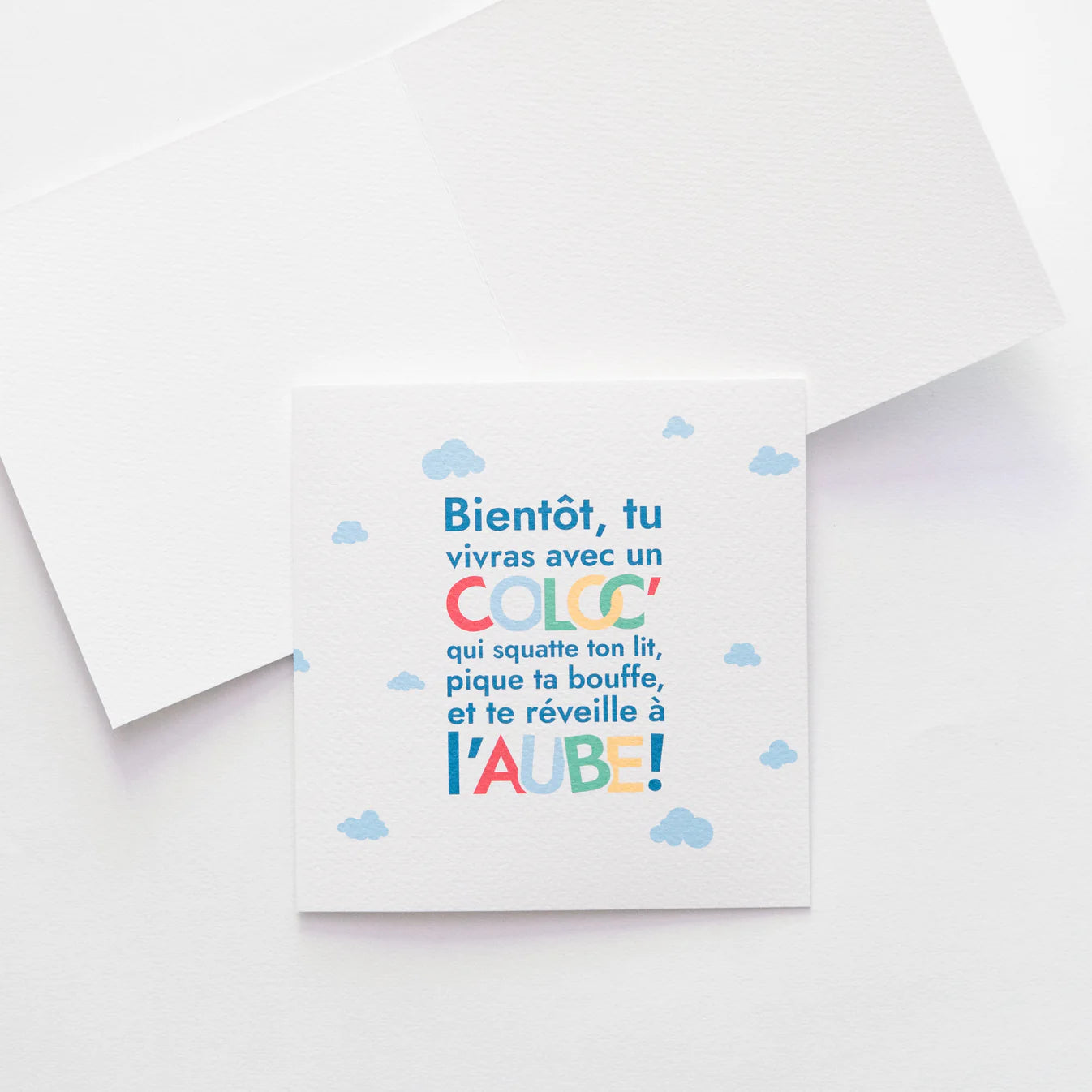 Cette carte de naissance pleine d’humour exprime avec légèreté ce que l’on ressent en secret : accueillir un bébé, c’est comme héberger un colocataire très exigeant, imprévisible et… totalement craquant. Idéale pour glisser un message complice à un futur parent, mêlant humour, douceur et sans aucune pression.