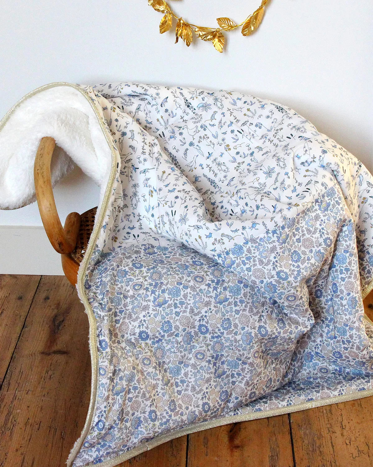 Gemaakt uit een mix van 2 Liberty® stoffen en aan de achterkant gevoerd met een ontzettend zachte en warme verbeterde fleece... De omtrek is afgewerkt met een gouden lamé bias voor dat kleine Barnabé chique tintje!