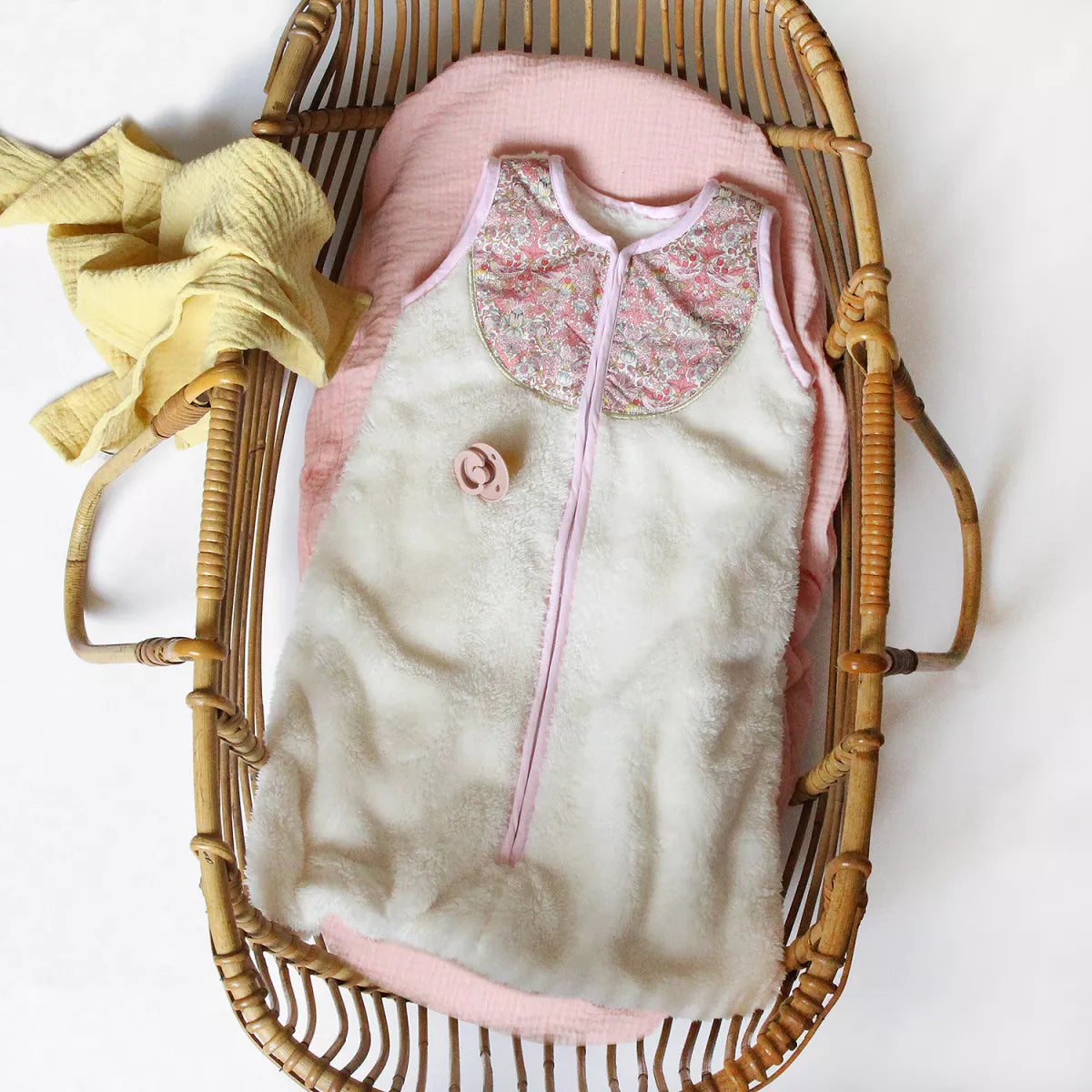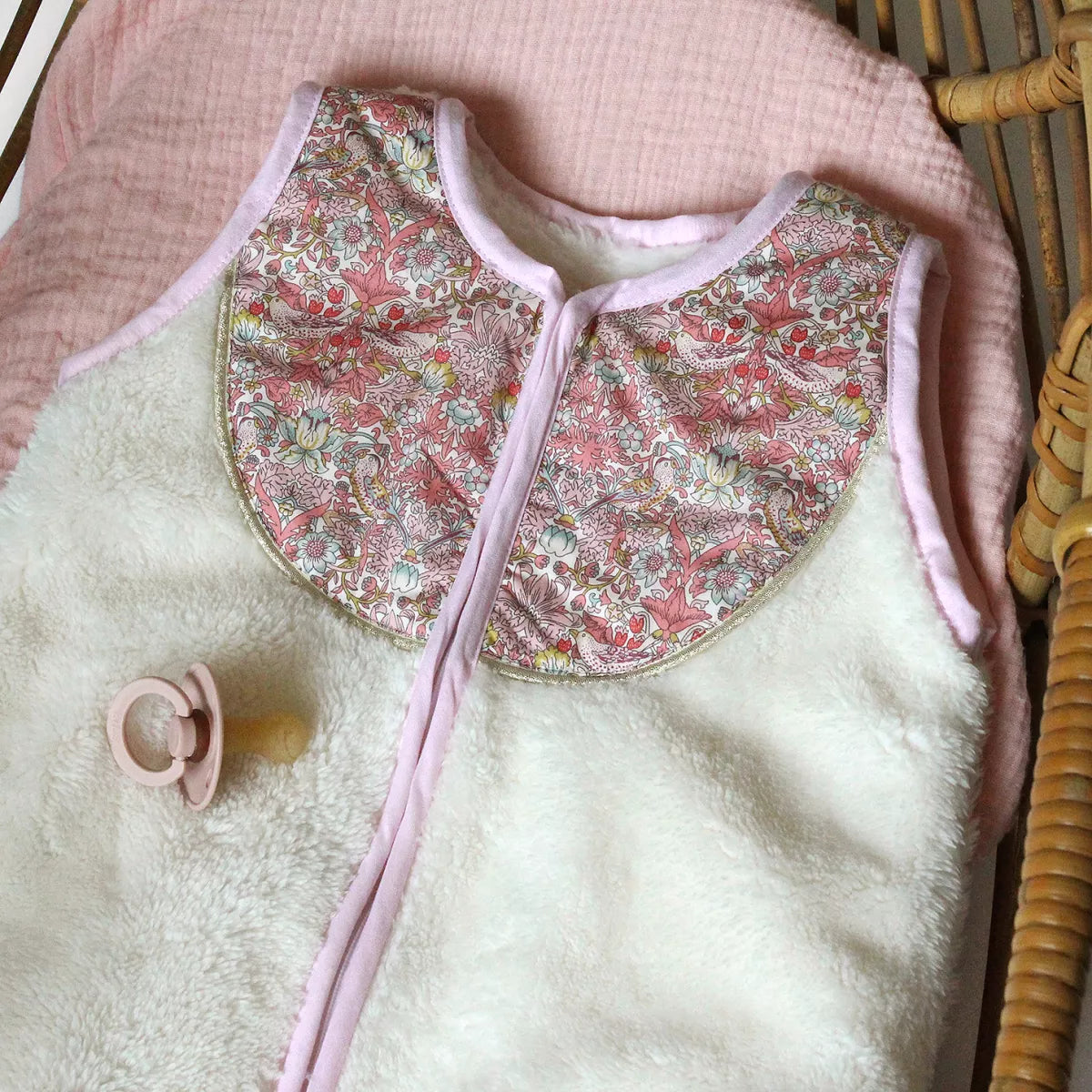Zeer mooie slaapzak van ultrazacht en donzig fleece met een chique slabbetje van Liberty®-stof, afgezet met gouden biezen. Ideaal voor een zachte en veilige slaap.