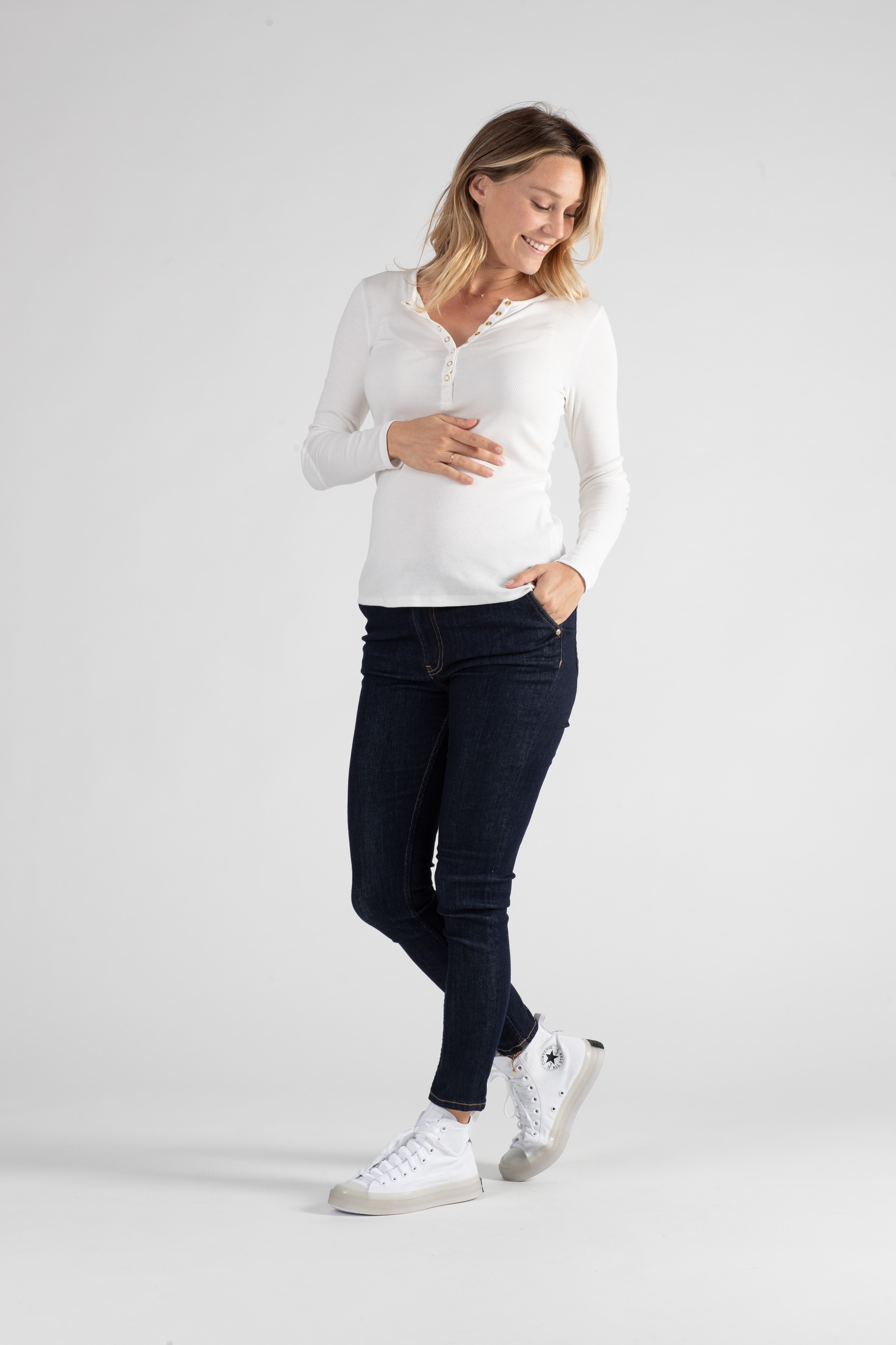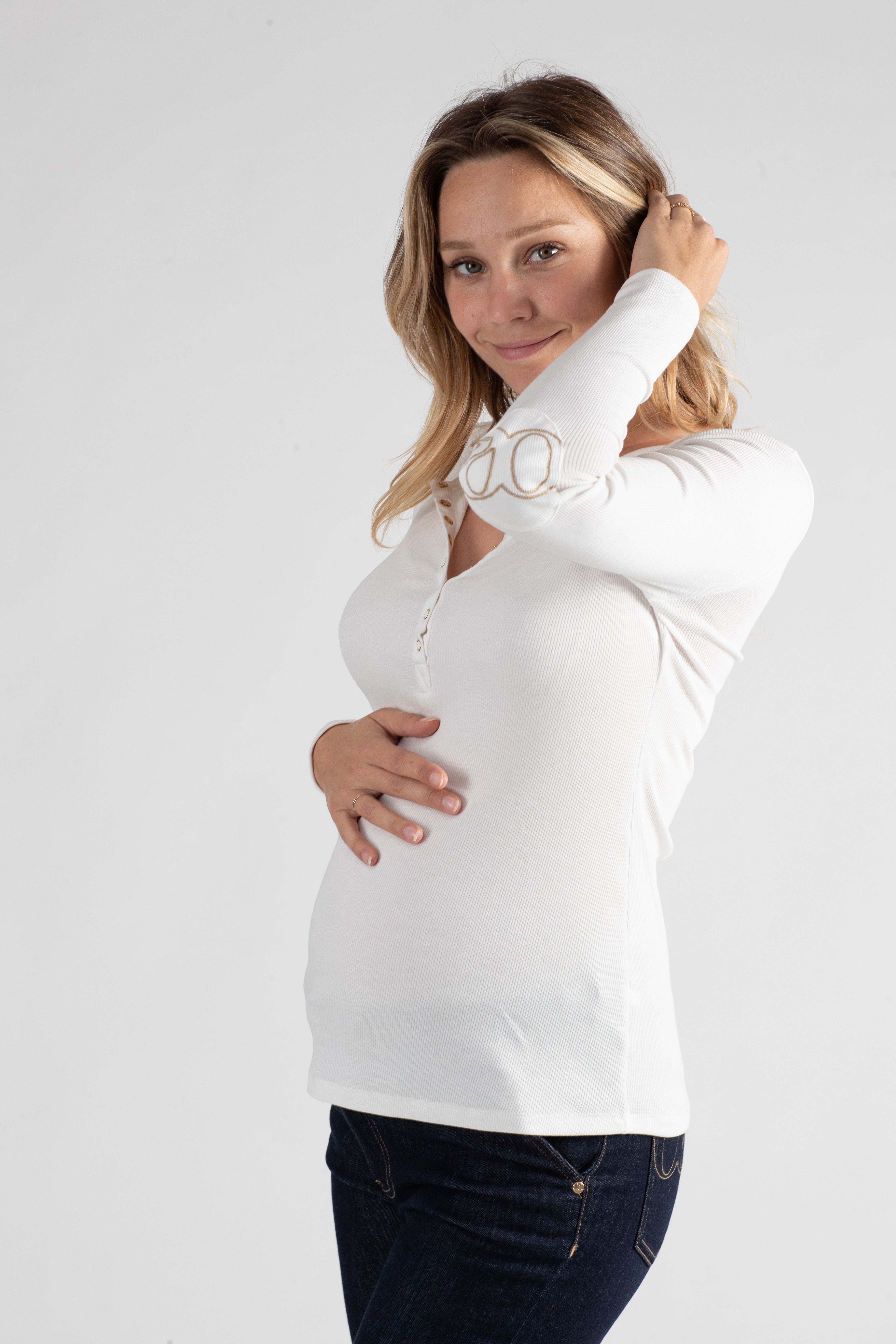 De knopen op de Tunesische kraag en de elleboogstukken, waarvan er één geborduurd is, geven dit topje met lange mouwen een echte subtiliteit. Dankzij de opening met drukknopen heeft u snel en gemakkelijk toegang tot uw borst om uw baby borstvoeding te geven.