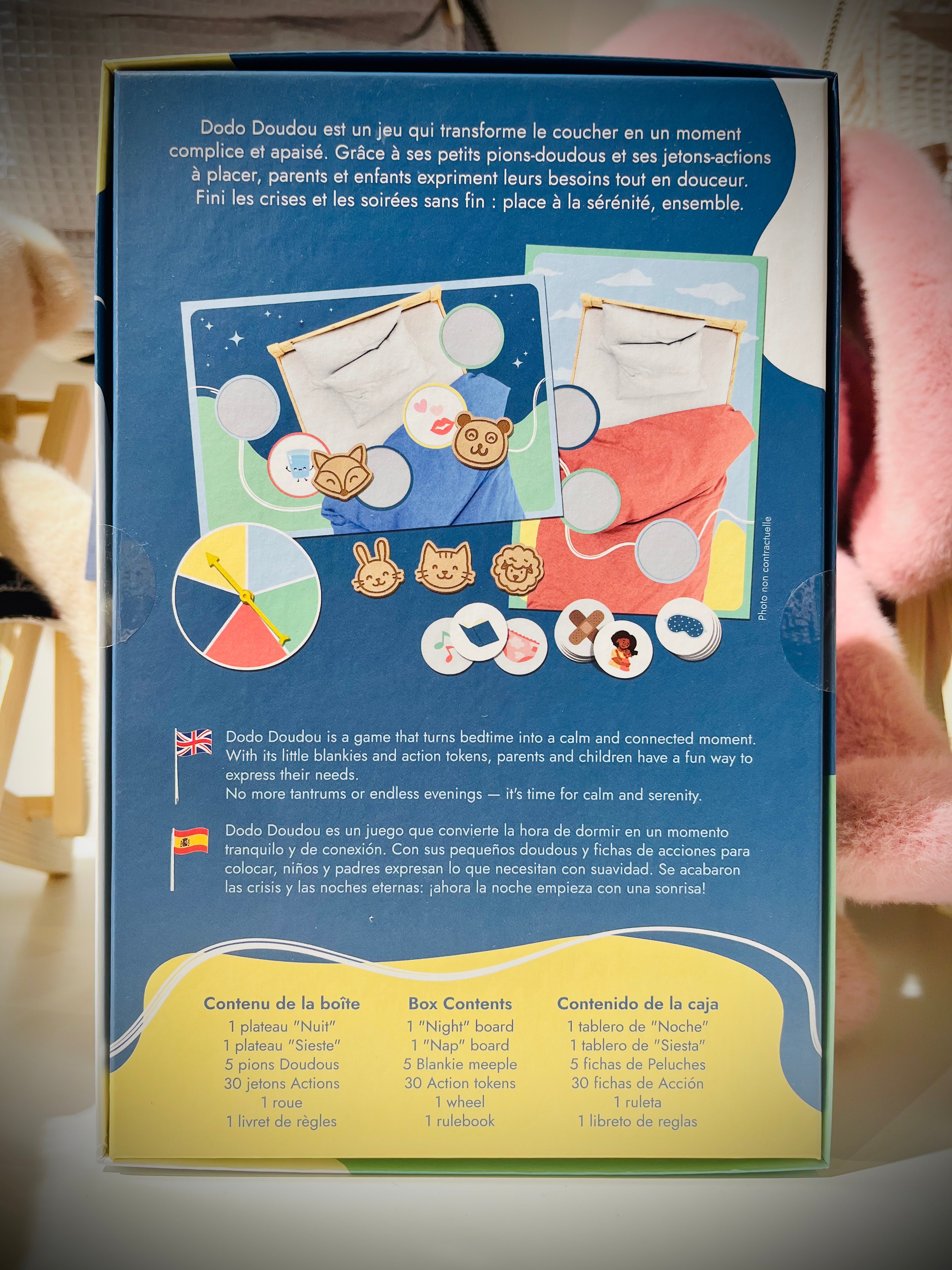 Le jeu Dodo Doudou transforme la routine du coucher en une douce aventure ludique. Pensé pour accompagner les tout-petits pas à pas vers le sommeil, il mêle gestes rassurants et rituels bienveillants pour apaiser la transition du jour à la nuit. Grâce à des cartes colorées et des consignes simples, l’enfant joue à endormir son doudou… et s’endort à son tour, en toute sérénité.