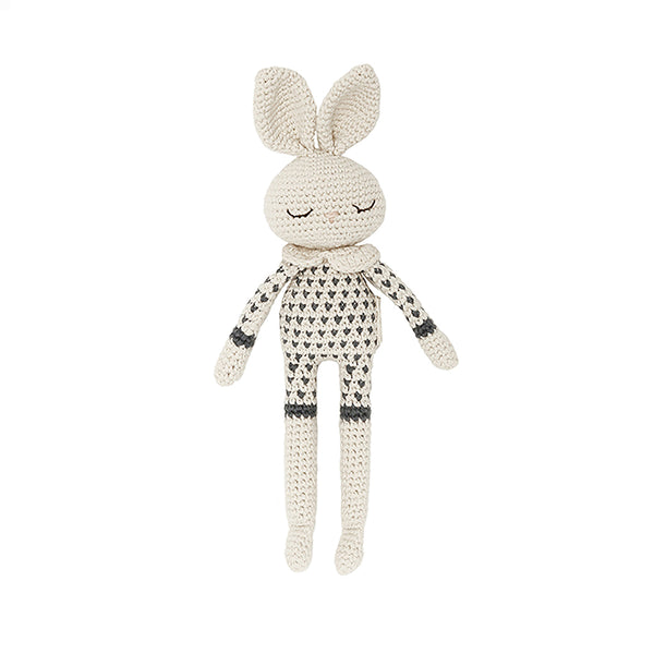 Avec ses longues oreilles, ses yeux paisiblement fermés et son col délicat, ce lapin en crochet incarne la tendresse à l’état pur. Tricoté à la main dans une maille serrée et douce, il offre à bébé un jouet rassurant, facile à attraper et à câliner. Sa texture en coton naturel stimule le toucher et accompagne les tout-petits dans leurs premières découvertes sensorielles.
