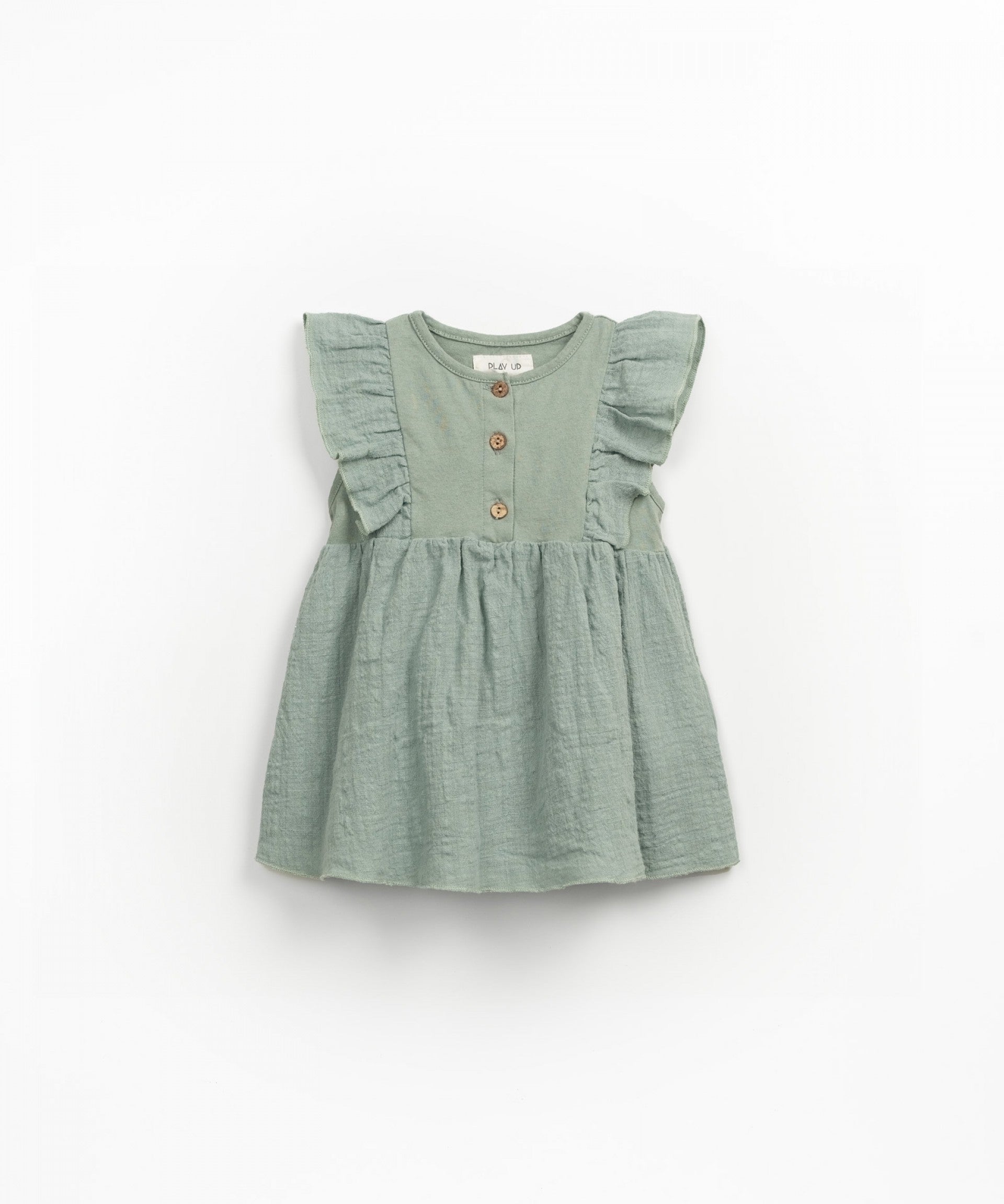 Cet été, votre petite fille sera la plus craquante avec cette jolie robe verte à volant de la marque Play Up. Cette robe est confectionnée en maille avec un mélange de coton biologique et de coton recyclé.  Elle présente des manches à volants, un col rond, une partie inférieure froncée et une ouverture supérieure avec des boutons en coco.