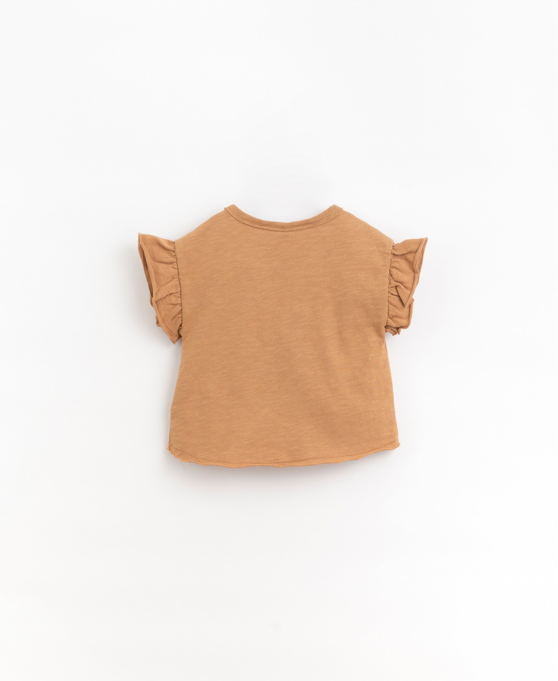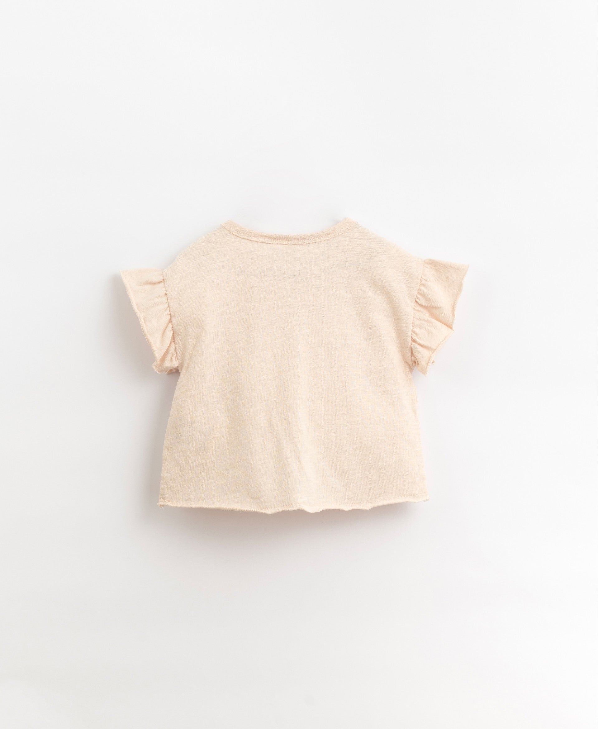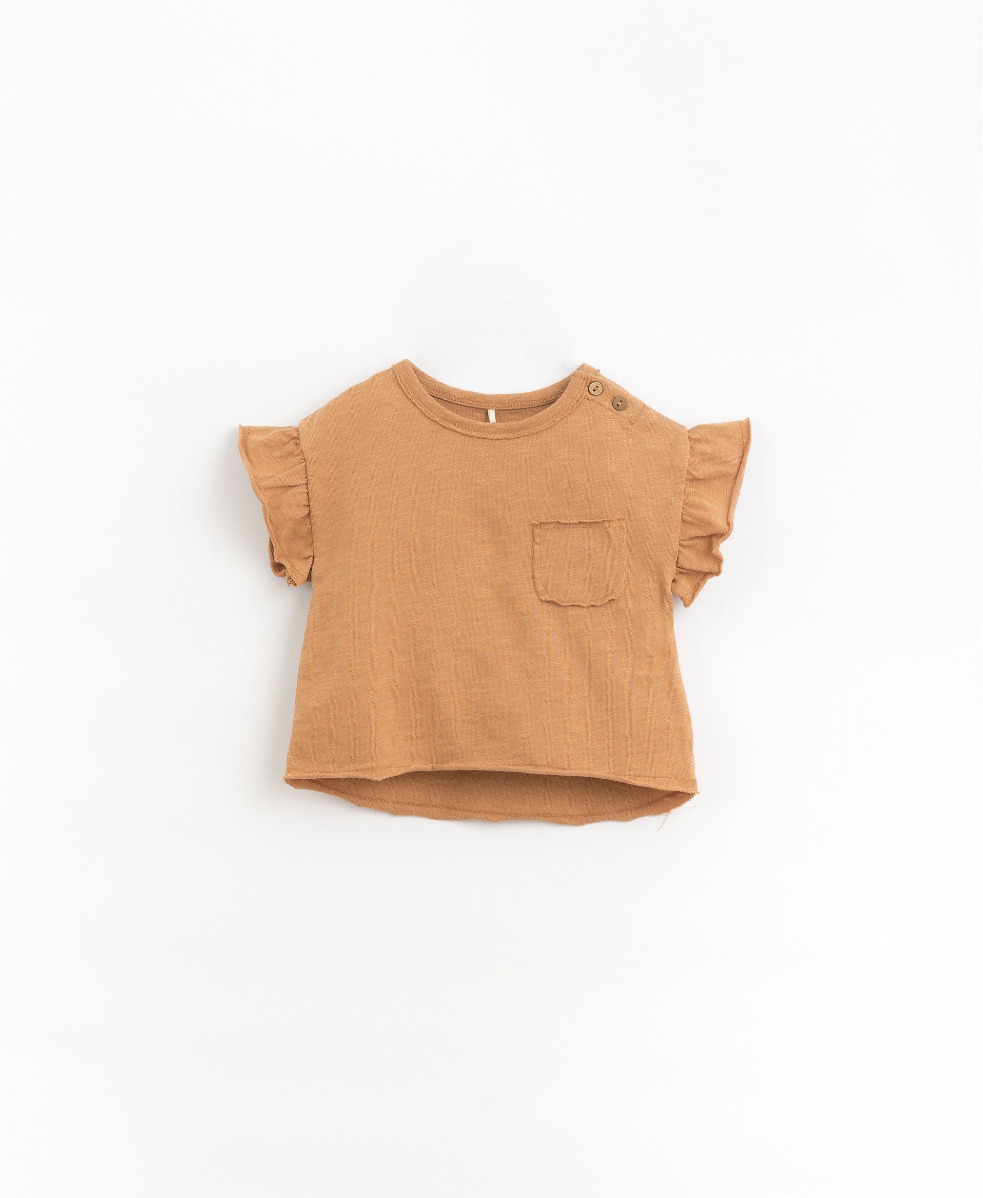 Dit gebreide T-shirt van biologisch katoen voor meisjes is verkrijgbaar in crème of oranje. Het is een item met een ronde halslijn en korte mouwen met kleine ruches, met een opening op de schouder met kokosknopen en een zakje op de borst. Het is een must-have in de garderobe van je kleintje van Play Up.